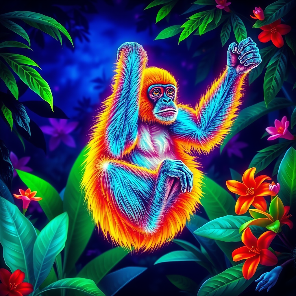 Vibrant neon monkey swinging through a jungle, its fur glowing in vivid shades of electric blue and fiery orange, with luminescent green leaves and exotic flowers surrounding it under a mystical blacklight sky.