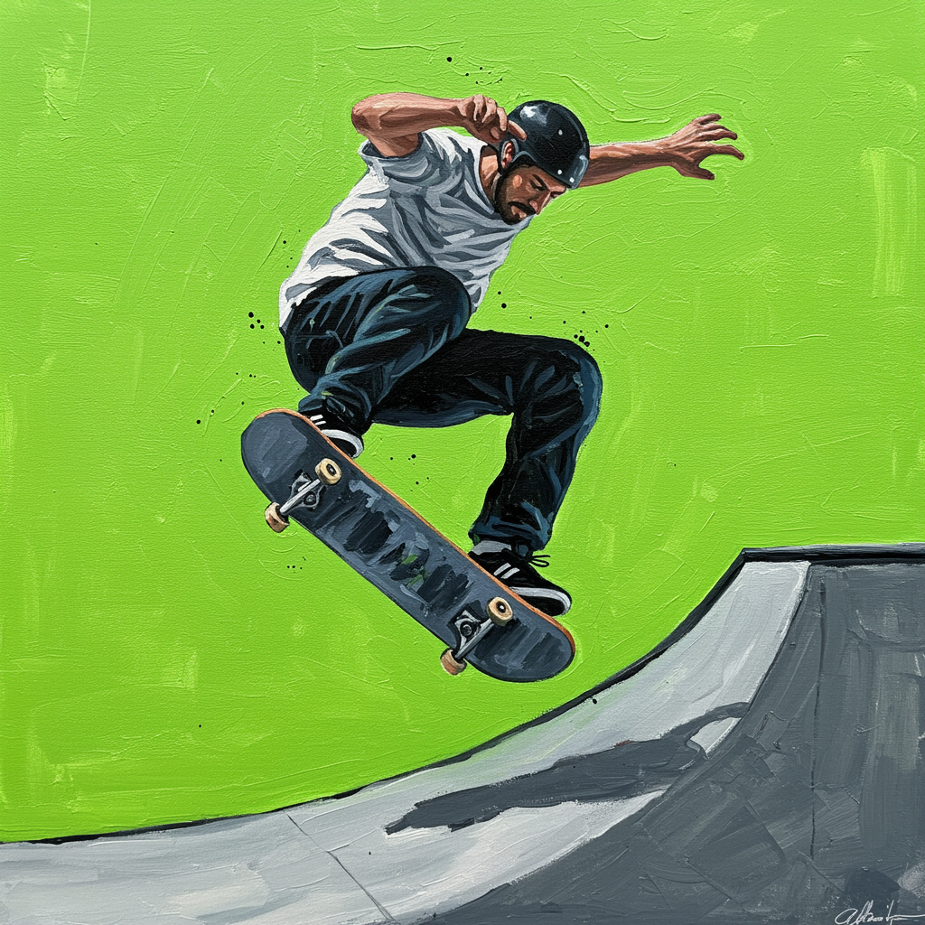 Vibrant painting capturing a skateboarder in mid-air, performing a gravity-defying trick against a neon green backdrop; the powerful brushstrokes convey movement, with a dynamic composition and intricate, expressive details enhancing the scene.