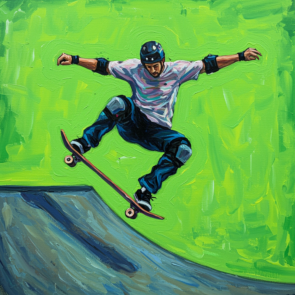 Vibrant painting of a skateboarder suspended mid-trick against a luminous neon green backdrop, the powerful brushstrokes capturing the energy of motion, with a fluid and dynamic composition, enriched by expressive and intricate details, in an elongated 2:3 aspect ratio.