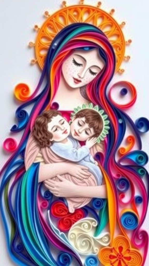 Vibrant paper quilling art of the Virgin Mary cradling baby Jesus, filled with an array of vivid colors and intricate swirling patterns.