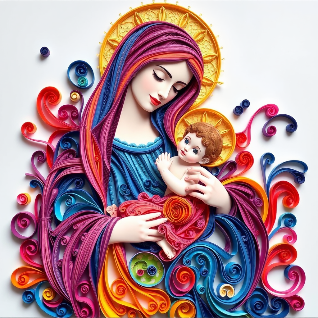 Vibrant paper quilling artwork depicting a serene Madonna cradling the infant Jesus, featuring a lush array of swirling colors and intricate patterns.