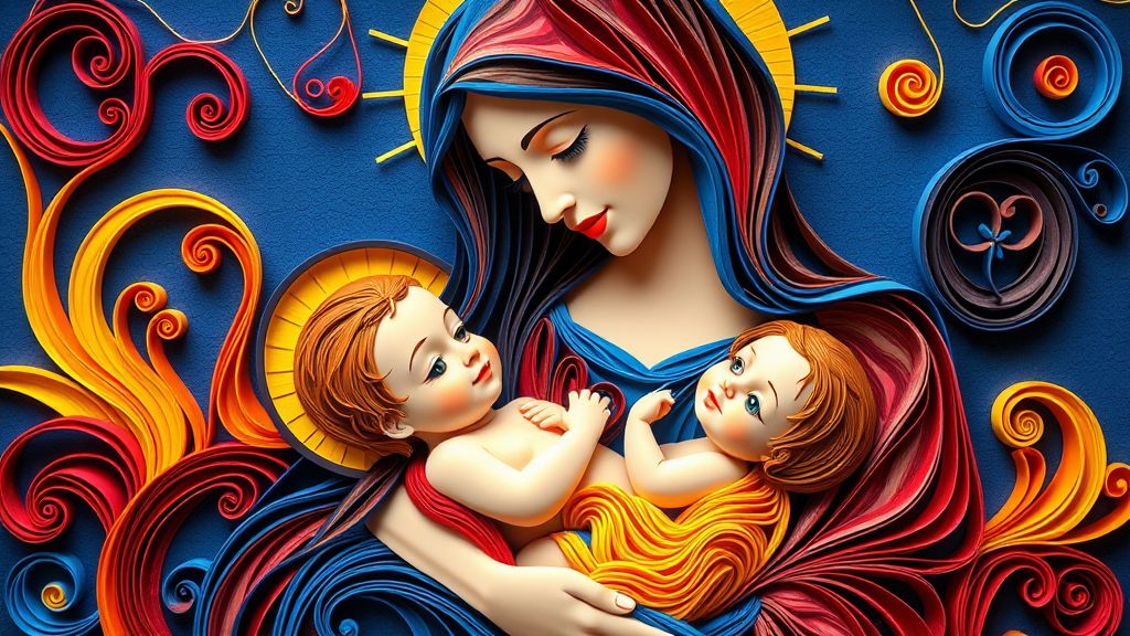 Vibrant paper quilling artwork featuring the Virgin Mary cradling baby Jesus, with swirling patterns and bold colors adding depth and emotion to the serene scene.