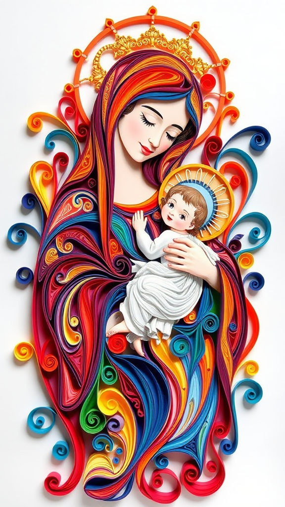 Vibrant paper quilling of Madonna cradling infant Jesus with an array of swirling colors and intricate patterns.