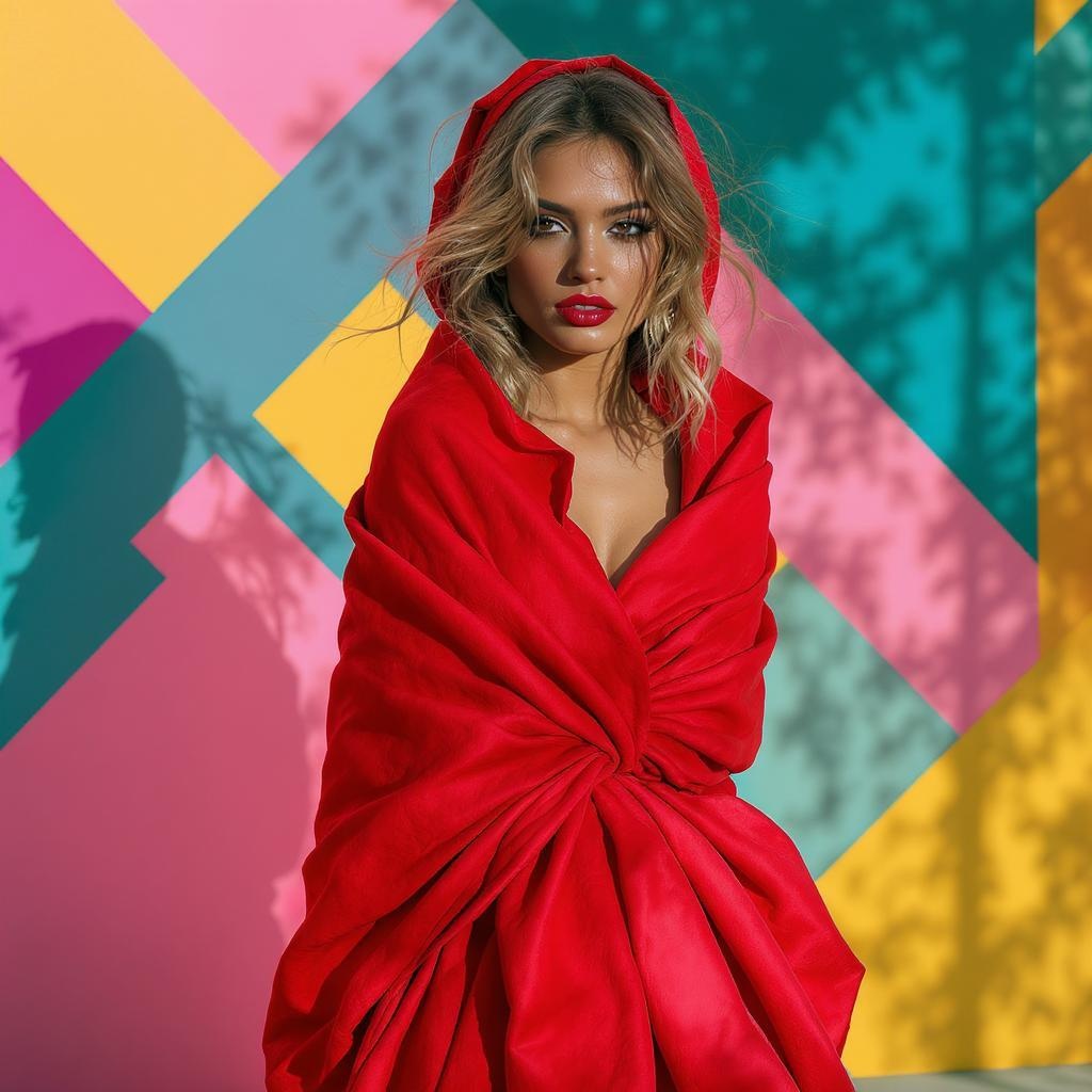 Vibrant photograph of a stylish Instagram fashion model draped in a vivid red wrap, set against a backdrop of colorful geometric patterns. The scene is reminiscent of Guy Aroch's dynamic style, created using Unreal Engine 5 and inspired by Helene Knoop's aesthetic. The composition glows with pastel hues accented by bold, defined lines and sun-drenched colors. Captured with the rich detail of a Fujifilm X-T4 and the clarity of a Sony FE 85mm lens, the image showcases a harmonious blend of natural light and vibrant tones, with an aspect ratio of 900:1600, evoking an essence of raw, expressive energy.