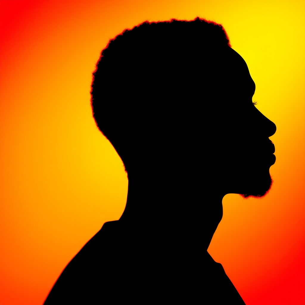 Vibrant portrait capturing the contrast of a black man's profile silhouette against a vivid orange background, utilizing a wide aperture camera setup to focus sharply on the silhouette's edge. Maintaining color richness and smoothness through a low ISO, the image embodies photorealism in ultra-high definition, with an aspect ratio of 9:16. Incorporate subtle elements of drama and intrigue to enhance the silhouette's mystery and depth, while maintaining the raw aesthetic essence of the scene.