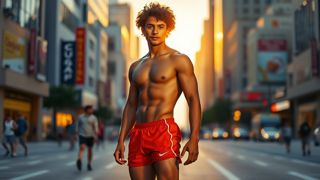 Vibrant portrait of a young man in the bustling city during the golden hour, standing confidently. He is strikingly handsome and athletic, with Mexican American and Latino heritage. He's dressed in bold, revealing shorts that highlight his well-defined, sun-kissed legs and sturdy feet. His perfectly chiseled face and hands exude a natural allure. The sunlight beautifully illuminates his short, dark curly hair, creating a halo-like effect. Captured with an award-winning approach, this photograph is shot on Kodak Portra 800 using a Hasselblad 500C with a 55mm f/1.8 lens. The image features extreme depth of field, utilizing available light to achieve high contrast and Ultra HD clarity, enhanced with HDR and DTM techniques, presented in mesmerizing 8K resolution.