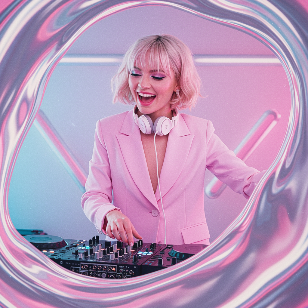 Vibrant portrait of DJ Chickie in a pastel pink suit, joyfully immersed in her music, depicted in the lively style of animated gifs. The scene exudes happycore energy with a focus on her dynamic, feminine form. The visual embraces elements of pigeoncore and is crafted with a sleek liquid metal texture. Her surroundings and presence are fluid and wavy, capturing her vibrant spirit. The atmosphere feels like a lively video animation, with a raw and energetic essence.
