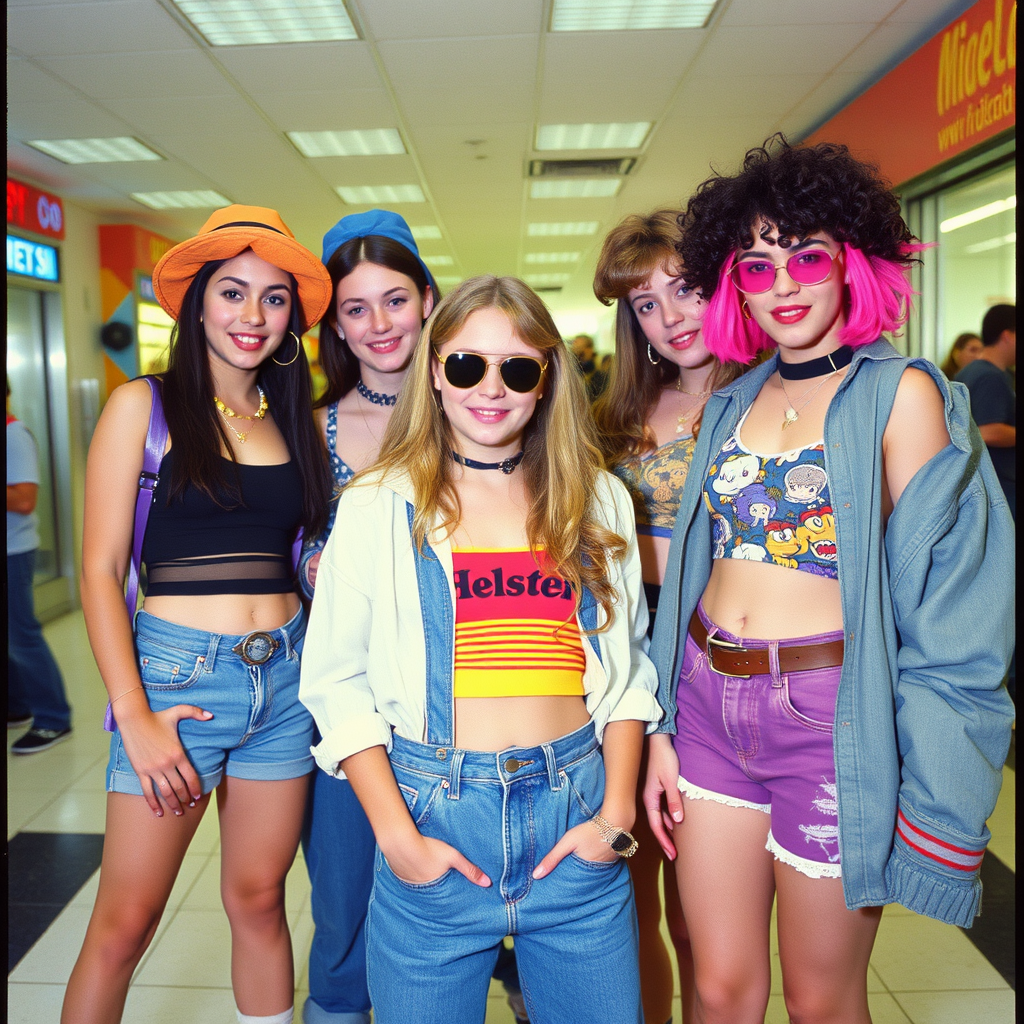 Vibrant portraits of eclectic 90's teens wearing bold retro outfits, captured with the grainy charm of a VHS camera, embracing their unique style with playful expressions and quirky poses in a nostalgic mall setting.