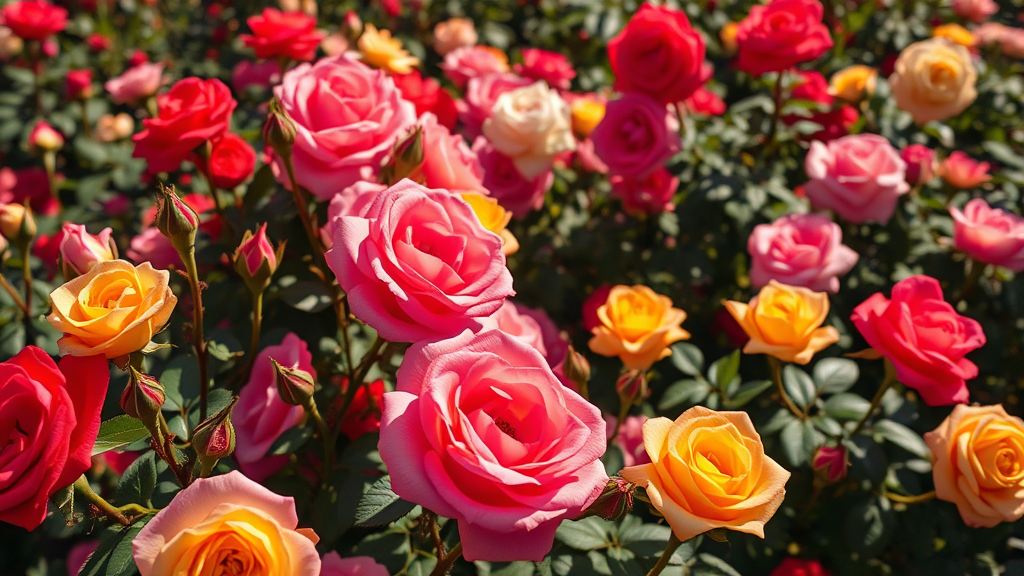 Vibrant rose garden filled with blooming roses and delicate rose buds, featuring an array of vivid colors including shades of red, pink, yellow, and white. Captured in soft morning light with a DSLR at 70mm, using f/22 to achieve photorealistic detail, shadows casting intricate patterns. High-angle perspective with hyper-detailed focus, in 8k resolution, showcasing uplight effects to enhance the lushness and color depth. The scene maintains a compelling and immersive ambiance.