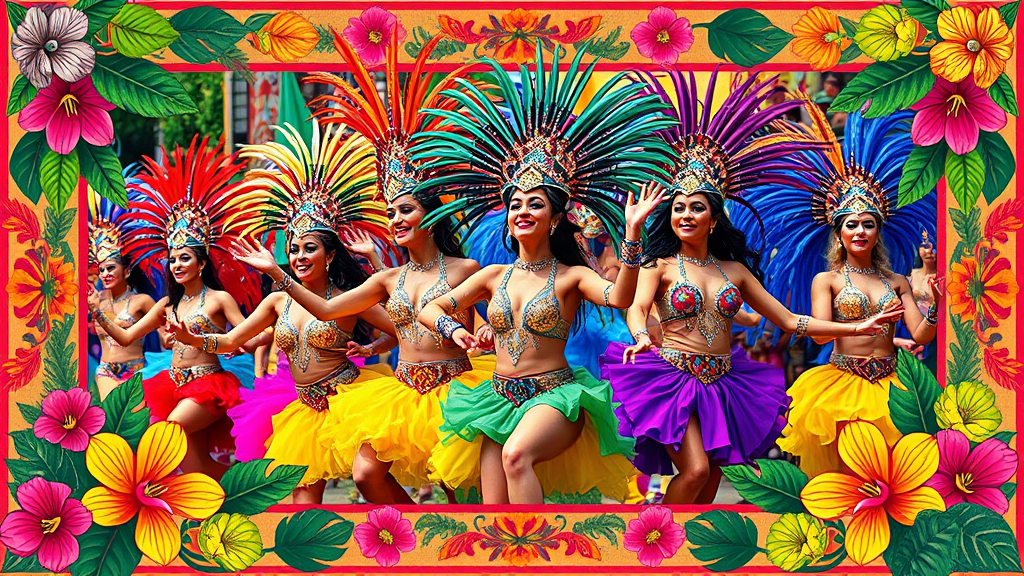 Vibrant scene of a Brazilian carnival celebration featuring lively dancers in colorful costumes, with intricate feathered headdresses and shimmering sequins, set against a festive background. The scene is framed with decorative borders inspired by traditional Brazilian patterns, filled with tropical flowers and abstract motifs, capturing the joyful spirit and rhythm of the festival. The vertical composition enhances the dynamic movement and energy of the celebration.
