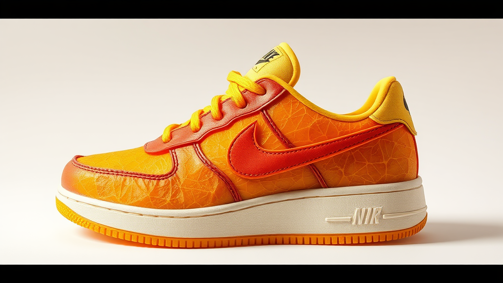 vibrant sneakers crafted from dried fruit peels, 3d illustration, bold colors, minimalist design, stunning visual artistry, nike emblem