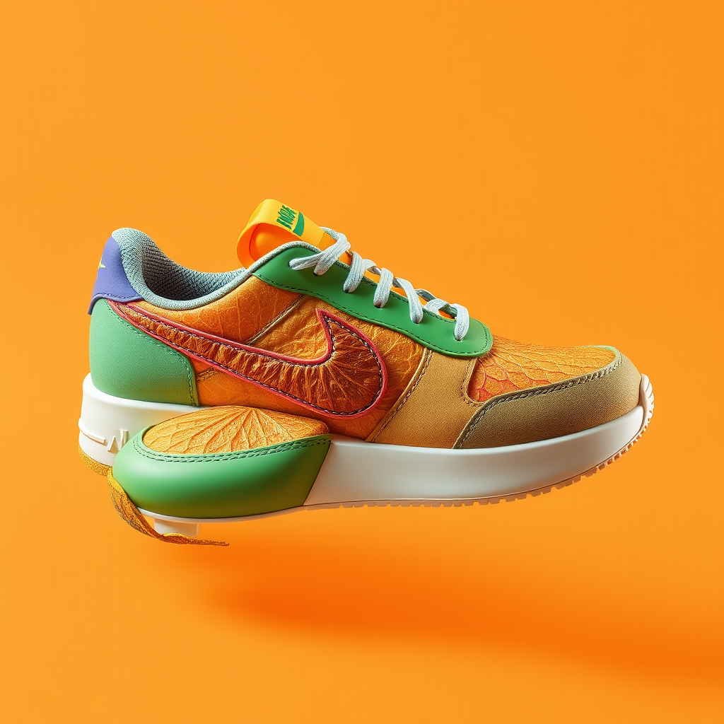 vibrant sneakers crafted from dried fruit peels, vivid hues, sleek design, stunning 3d illustration, minimalistic background, nike swoosh emblem