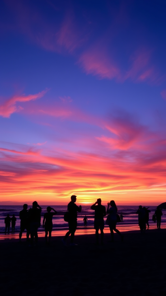 Vibrant Sunset Silhouettes: Visit the shoreline in the early evening to photograph the striking outlines of beachgoers contrasted against the vivid hues of the descending sun.
