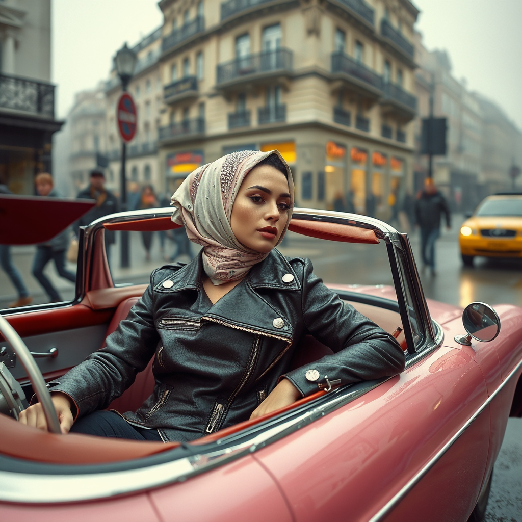 Vibrant technicolor street photography of a stunning woman in distressed leather jacket with rhinestone-embellished headscarf reclining in the passenger seat of a sleek 1959 pink convertible on a drizzly London afternoon, captured with the nostalgic charm of a Arriflex 35 BL camera and Canon FL 20-35 mm speed booster prime lenses on a misty London street surrounded by Victorian architecture and bustling pedestrians.