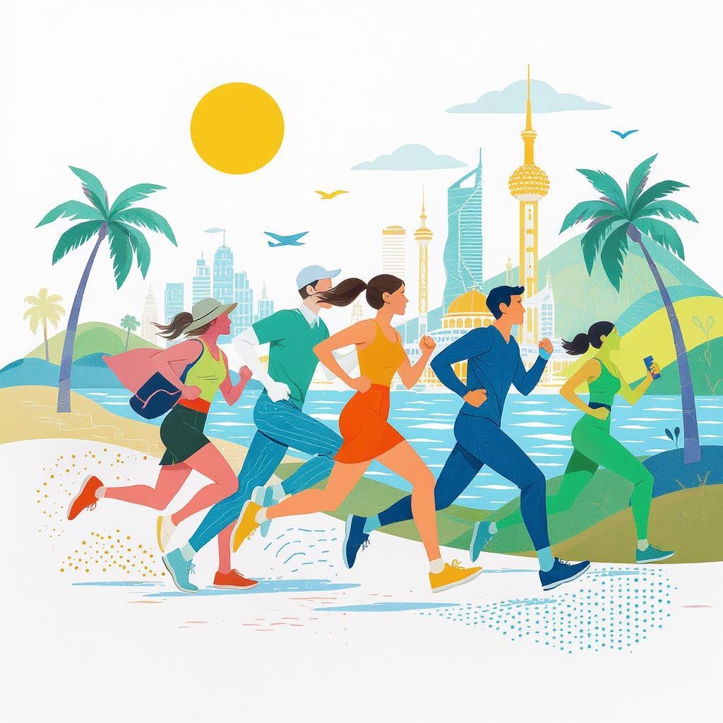 Vibrant tourism depiction, dynamic runners in motion, colorful palette on a clean background, playful travel theme, abstract forms, sleek design, minimalistic approach, chao100 innovative style, energetic atmosphere, creative twist.