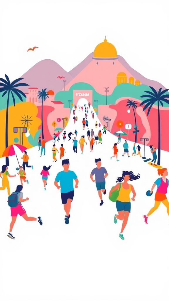 Vibrant tourism scene featuring runners, colorful palette, simple shapes on a white background, minimalist flat design, lively and fresh atmosphere with balanced chaos, energetic illustration.