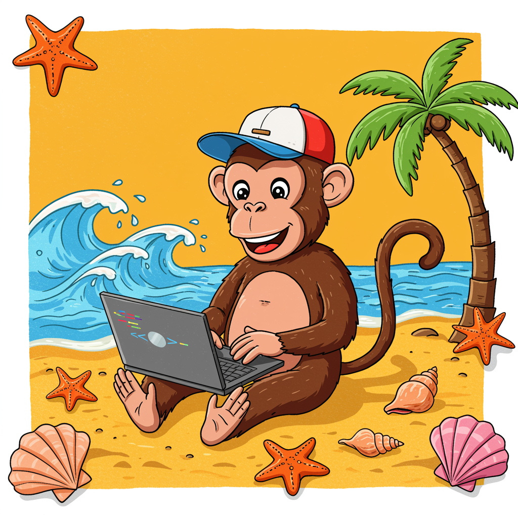 Vibrant vector illustration of a cheerful monkey wearing a baseball cap, sitting on a sunny beach with a laptop, passionately coding AI applications. Delicate seashells and palm trees frame the scene, as colorful waves gently lap at the shore, all bathed in bright, playful colors, conveying a sense of tropical creativity and innovation.