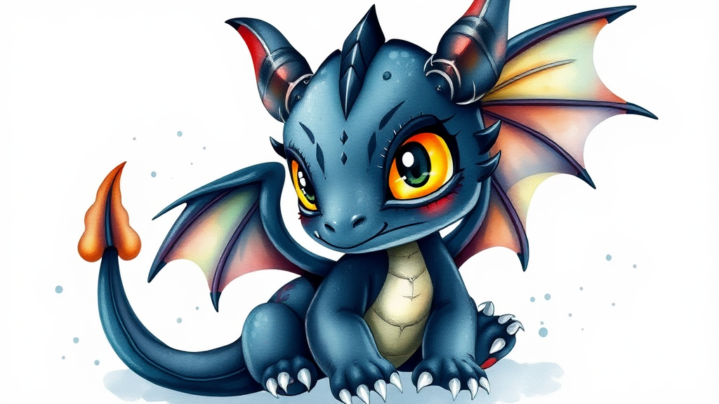 Vibrant watercolor illustration of an adorable black baby dragon with enchanting yellow eyes and delicate wings, set against a minimalist white background, adorned with intricate ornamental patterns. The image exudes a whimsical charm with a harmonious blend of colors, capturing the essence of a mystical creature in a dark mode ornamental style.