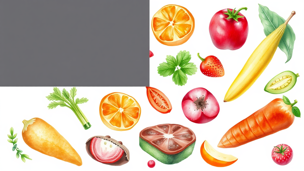Vibrant watercolor illustration of various foods, each piece isolated on a bright white background, emphasizing detail and vivid color; designed without any shadows for a clean, fresh appearance; perfect for creative and artistic projects needing a burst of culinary charm.