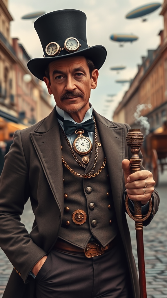 Victorian-era adventurer Phileas Fogg dons a bespoke steampunk ensemble, complete with a waistcoat adorned with intricate brass gears and a pocket watch linked by fine copper chains. His top hat is enhanced with small, swiveling goggles reflecting the glint of mechanical wonders. Fogg's polished leather boots have subtle steam-emitting vents, while his hand clutches a finely crafted cane featuring a hidden compass and barometer. In the background, a bustling cobblestone street lined with steam-powered carriages and zeppelins drifting in the sky sets the scene. His expression exudes a mix of determination and curiosity, ready for his next grand journey.