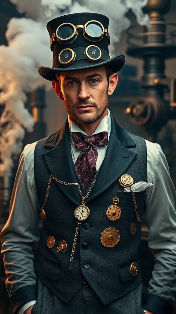 "Victorian gentleman with an air of mystery, dressed in a tailored waistcoat adorned with intricate brass gears and clockwork accessories. His top hat boasts a pair of polished goggles resting atop, while a monocle enhances his keen gaze. A pocket watch dangles from his vest, its chain glinting in the ambient light of a smoke-filled room. He stands confidently in front of a backdrop of billowing steam and complex mechanical contraptions, embodying the epitome of elegance and adventurous spirit in a world where science and fantasy converge."