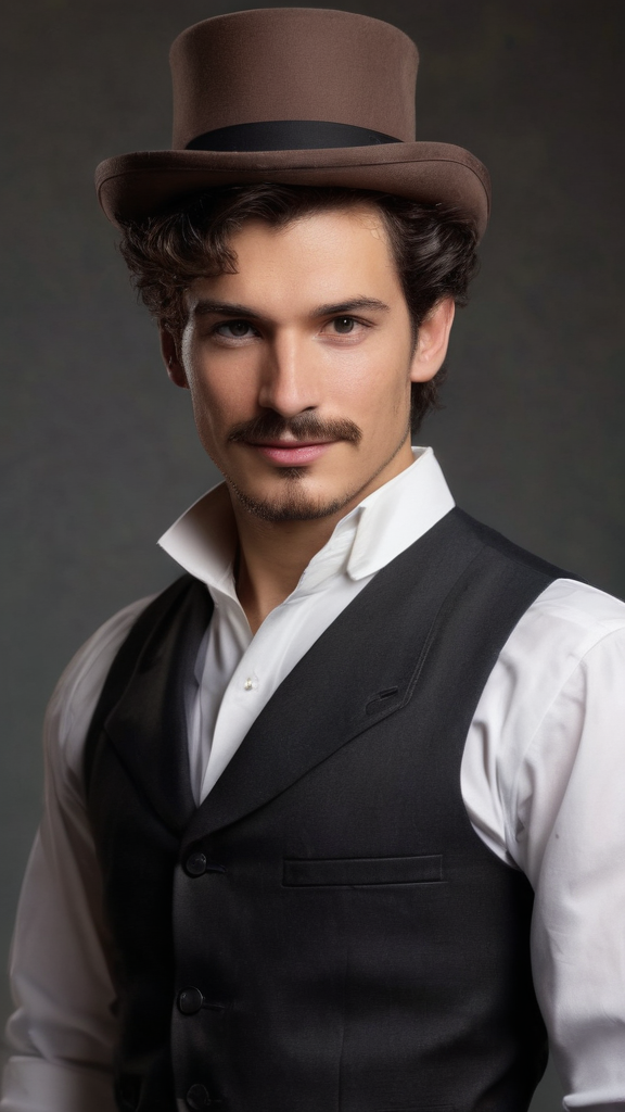 Victorian steampunk. A man is a creator of high-end toys and gadgets. His greatest creations are a time machine, and a life+sized marionette that becomes a real woman and then his wife. They travel the world and time together on all kinds of adventures. He is tall, handsome, masculine, slim but muscular, sinewy. Caucasian male of English descent. Short wavy dark brown hair, side parted and combed back. Strong brow and jaw, light brown eyes. Sideburns and handlebar mustache. He He wears a white shirt with the sleeves rolled up, and dark grey trousers with a black belt and black shoes. The first few buttons on his shirt are unbuttoned, he's always working on something. Always a smile on his face, happy with his wife and to be working steadily, usually a tool in his hands watching gears turning. His wife is a feminine Victorian woman with medium length curly dark brown hair and cornflower blue eyes. Lovely sweet pretty face, moderate make-up. She is usually in a frilly white dress with a bustle, white gloves and black shoes, a wide brimmed hat with flowers on top of the brim. She assist him with anything he needs, but she is no wallflower. She is smart, intelligent, and spirited for a woman of her time.