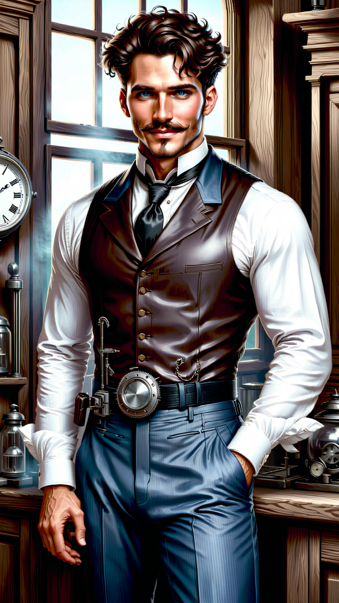 Victorian steampunk. A man is a creator of high-end toys and gadgets. His greatest creations are a time machine, and a life+sized marionette that becomes a real woman and then his wife. They travel the world and time together on all kinds of adventures. He is tall, handsome, masculine, slim but muscular, sinewy. Caucasian male of English descent. Short wavy dark brown hair, side parted and combed back. Strong brow and jaw, light brown eyes. Sideburns and handlebar mustache. He He wears a white shirt with the sleeves rolled up, and dark grey trousers with a black belt and black shoes. The first few buttons on his shirt are unbuttoned, he's always working on something. Always a smile on his face, happy with his wife and to be working steadily, usually a tool in his hands watching gears turning. His wife is a feminine Victorian woman with medium length curly dark brown hair and cornflower blue eyes. Lovely sweet pretty face, moderate make-up. She is usually in a frilly white dress with a bustle, white gloves and black shoes, a wide brimmed hat with flowers on top of the brim. She assist him with anything he needs, but she is no wallflower. She is smart, intelligent, and spirited for a woman of her time.