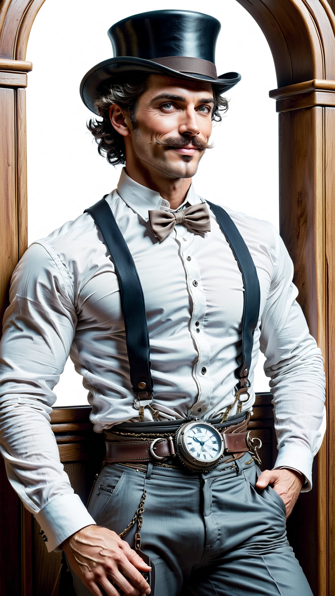 Victorian steampunk. A man is a creator of high-end toys and gadgets. His greatest creations are a time machine, and a life+sized marionette that becomes a real woman and then his wife. They travel the world and time together on all kinds of adventures. He is tall, handsome, masculine, slim but muscular, sinewy. Caucasian male of English descent. Short wavy dark brown hair, side parted and combed back. Strong brow and jaw, light brown eyes. Sideburns and handlebar mustache. He He wears a white shirt with the sleeves rolled up, and dark grey trousers with a black belt and black shoes. The first few buttons on his shirt are unbuttoned, he's always working on something. Always a smile on his face, happy with his wife and to be working steadily, usually a tool in his hands watching gears turning. His wife is a feminine Victorian woman with medium length curly dark brown hair and cornflower blue eyes. Lovely sweet pretty face, moderate make-up. She is usually in a frilly white dress with a bustle, white gloves and black shoes, a wide brimmed hat with flowers on top of the brim. She assist him with anything he needs, but she is no wallflower. She is smart, intelligent, and spirited for a woman of her time.