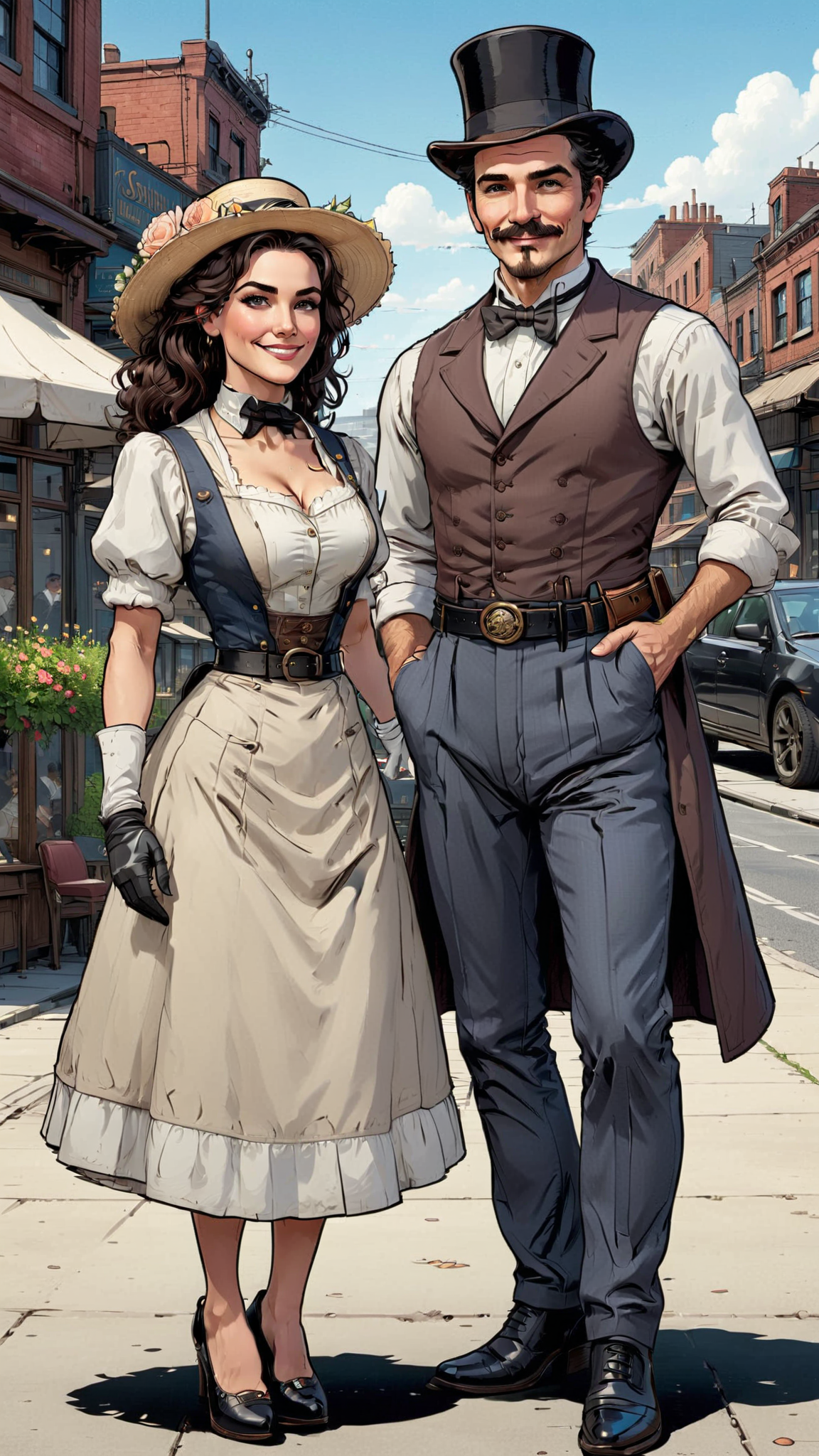 Victorian steampunk. A man is a creator of high-end toys and gadgets. His greatest creations are a time machine, and a life+sized marionette that becomes a real woman and then his wife. They travel the world and time together on all kinds of adventures. He is tall, handsome, masculine, slim but muscular, sinewy. Caucasian male of English descent. Short wavy dark brown hair, side parted and combed back. Strong brow and jaw, light brown eyes. Sideburns and handlebar mustache. He He wears a white shirt with the sleeves rolled up, and dark grey trousers with a black belt and black shoes. The first few buttons on his shirt are unbuttoned, he's always working on something. Always a smile on his face, happy with his wife and to be working steadily, usually a tool in his hands watching gears turning. His wife is a feminine Victorian woman with medium length curly dark brown hair and cornflower blue eyes. Lovely sweet pretty face, moderate make-up. She is usually in a frilly white dress with a bustle, white gloves and black shoes, a wide brimmed hat with flowers on top of the brim. She assist him with anything he needs, but she is no wallflower. She is smart, intelligent, and spirited for a woman of her time.