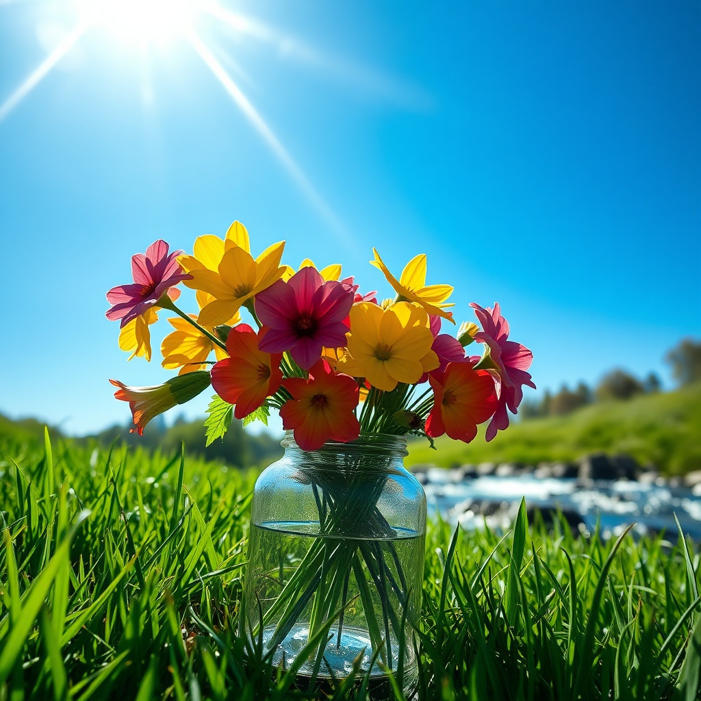 View of vibrant flowers inside a crystal-clear glass bottle resting on lush grass, with sunlight casting dynamic highlights. It's a bright spring day under a clear blue sky, captured in high detail and sharp focus, evoking a cinematic 8k UHD experience. A dark, intense river flows nearby, adding a dramatic and tense atmosphere. The scene is rendered in HDR CGI 3D for an immersive feel. Careful attention to anatomy ensures realism, avoiding any distortions or unnatural elements.