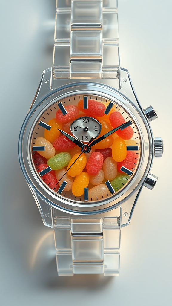 View: top-down cinematic fine art photography in a professional studio setting, showcasing a transparent vinyl watch crafted from translucent glass. The interior brimming with vibrant jelly beans, the watch exhibits a high refractive index. The composition features frosted glass with pastel hues accented by a subtle pale yellow highlight. The aesthetic is in the style of Dieter Rams, with illustrative elements emphasizing its design.