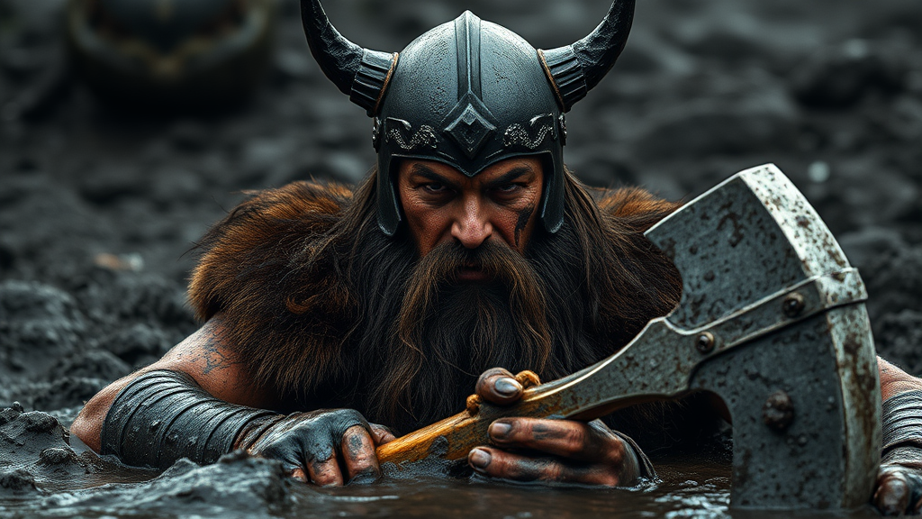 Viking King rises from thick, wet, obsidian mud; a menacing figure. His dark iron helmet bears two imposing black horns. His face, smeared with fierce dark warpaint, features a tangled, gritty black beard and a deep, weathered scar slashing across his cheek. His eyes blaze with fury as he grips a massive Viking axe, its blade flashing with lethal intent. The cinematic lighting casts dramatic shadows, while ethereal, volumetric rays cut through the gloom. Thick mud drips steadily from his armor, adding to the foreboding atmosphere.