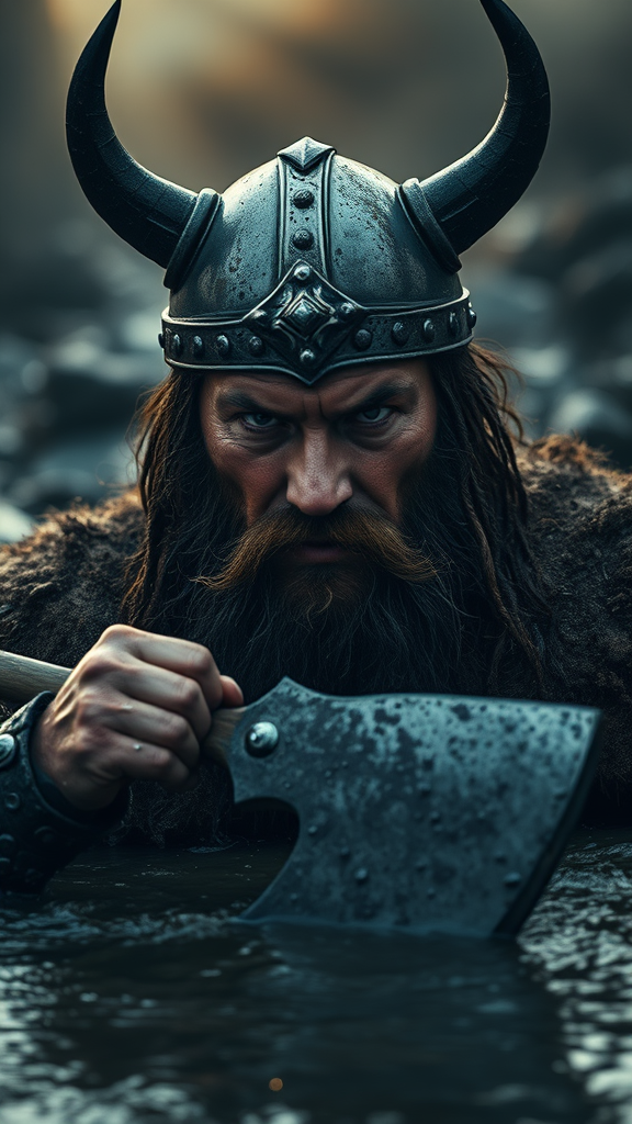 Viking King rising from slick dark mud, metal helmet glistening with two imposing black horns curving outward, fierce warpaint accentuating his intense gaze, scruffy unkempt black beard framing an enraged expression, noticeable scar crossing his rugged face, gripping a formidable Viking Axe tightly, cinematic lighting casting dramatic shadows, ethereal volumetric rays cutting through the dense air, atmosphere charged with moody tension, droplets of mud dripping from his imposing form.