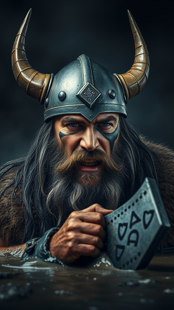Viking King rising from slick, obsidian mud, wearing a rugged metal helmet adorned with twin shadowy horns; face streaked with intense dark warpaint; scraggly, raven-colored beard framing a grimace of raw fury; jagged scar slashing across his cheek; gripping a formidable Viking axe; illuminated by dramatic lighting with ethereal beams; atmosphere dense with gloom, mud dripping and glistening.