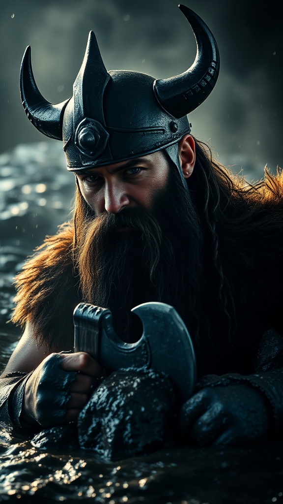 Viking King rising from thick, glistening black mud, his presence commanding and fierce. A dark, imposing helmet crowned with curved black horns accentuates his formidable aura. His face is a canvas of dark warpaint, a scruffy black beard framing his intense, angry eyes. A jagged scar slices across his cheek, telling tales of past battles. Clutched in his powerful grip is a menacing Viking Axe. The atmosphere is rich with cinematic lighting, casting dramatic volumetric rays through the mist, illuminating the scene with a moody, ominous glow as droplets of mud cascade down his figure.