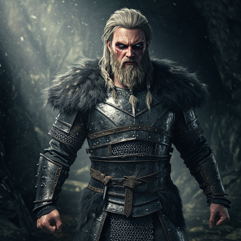 Viking warrior exuding fierce determination, boasting flowing ash-blonde hair and a rugged beard, his skin pale yet striking against the bold blue of his eyes. His face features a perfect symmetry with a blend of strength and elegance, possessing haunting, angelic qualities. Clad in battle-worn armor that speaks of numerous conflicts, he wears grey chainmail and intricately detailed lamellar armor accented by the dark, luxuriant fur of a black beast. Caught in a shaft of dramatic, ethereal light within a shadowy cave setting, the atmosphere is intense and fantastical, reminiscent of a mythical saga. Standing in a dynamic, commanding pose, every element crafted with stunning realism and fine details. The scene is illuminated with a soft glow, displaying a deep focus, with selective blurring adding a cinematic, ultra-detailed quality, rendered in 8k photorealism with vray precision, capturing the essence of an epic Dungeons & Dragons tableau.