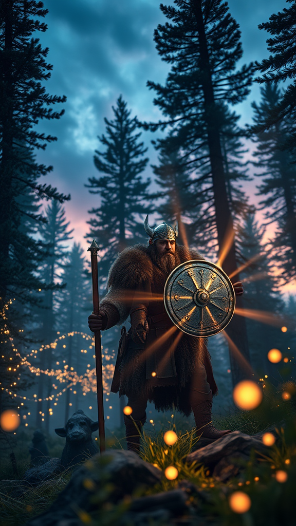 Viking warrior in a breathtaking landscape, captured in photorealistic detail with dynamic movement, surrounded by enchanting fairy lights and striking volumetric rays, enhanced with rich HDR tones, set in a towering pine forest under a twilight sky, the atmosphere is magical and immersive.