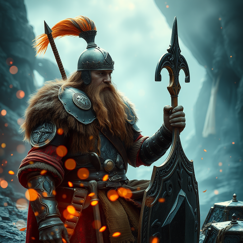Viking warrior in a photorealistic setting, vibrant and dynamic scene, exquisitely detailed, enchanted fairy lights dancing around, soft volumetric rays of light streaming through the mist, rich HDR tones, vertical composition capturing the mystique and grandeur of the Norse landscape, subtle hints of shimmering armor and ancient runes etched in stone.