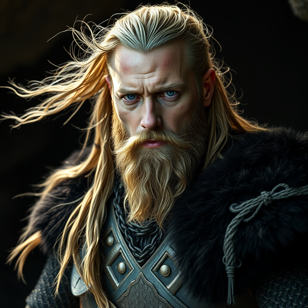 Viking warrior with fierce presence, flowing long blonde hair and rugged beard, pale skin with battle scars, piercing blue eyes, perfectly symmetrical yet strikingly bold features, intricate mixture of broad and narrow features, possessing an otherworldly allure with a touch of angelic perfection, clad in weathered armor marked by battle, adorned with grey chainmail and layered black animal fur cloak, bathed in dramatic light casting sun and god rays, set within a dimly lit cave for an intense fantasy D&D scene, captured in a dynamic, full-body pose, exuding realism with soft illumination and depth, a cinematic 8k hyperdetailed vray render showcasing ultra-detailed craftsmanship.