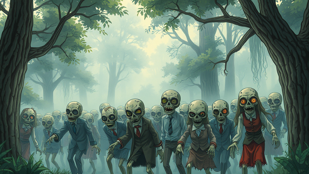 Vintage anime-inspired scene depicting a horde of whimsical zombies, each uniquely designed with intricate detail, marching through a misty forest. Lush, hand-drawn landscapes typical of a Hayao Miyazaki film frame the scene, where ethereal light filters through ancient trees. The atmosphere blends a sense of wonder and eerie suspense, showcasing elegantly decayed attire on the zombies, with expressive eyes that hint at forgotten stories, all while maintaining a nostalgic, retro anime aesthetic.