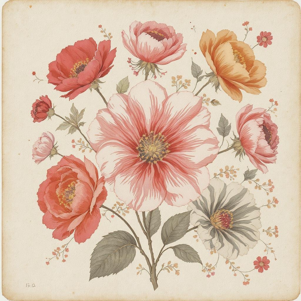 Vintage blossoms :: nostalgic design motif :: vibrant hues :: minimalistic --aspect ratio 2:3 --refinement level 2 --complexity 750