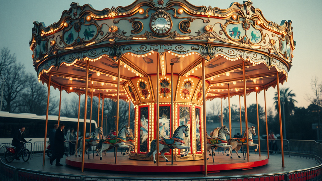 Vintage carousel photograph, ethereal atmosphere, social media vibe, ultra-high resolution, minimalist, contemporary aesthetic, aspect ratio 4:3.