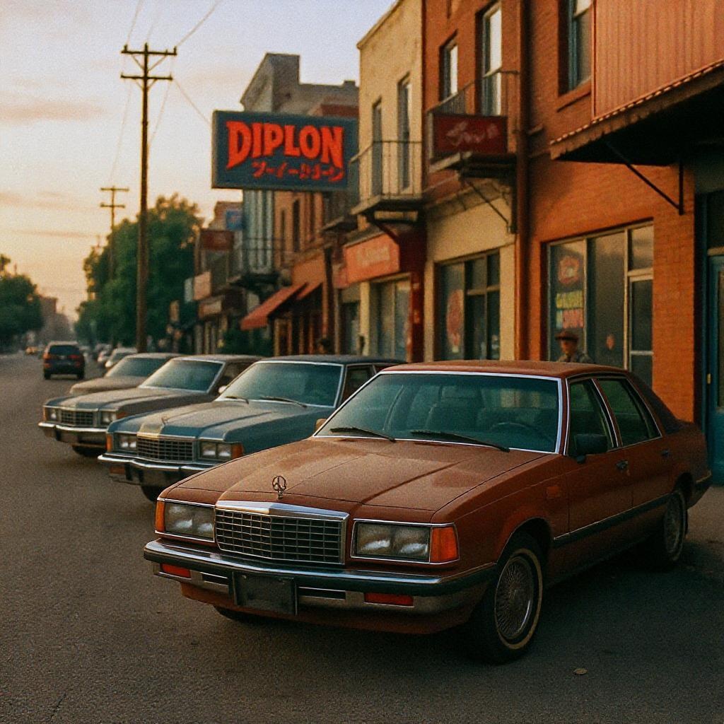 Vintage classic cars parked against an urban streetscape backdrop, exuding a nostalgic 1990s vibe. Shot on a 35mm film camera, capturing the rich details and vibrant colors reminiscent of that era. The scene is bathed in the warm glow of a golden hour, with subtle creative touches like retro billboards or passersby in classic 90s fashion, evoking a sense of timelessness while maintaining the authenticity of the scene.