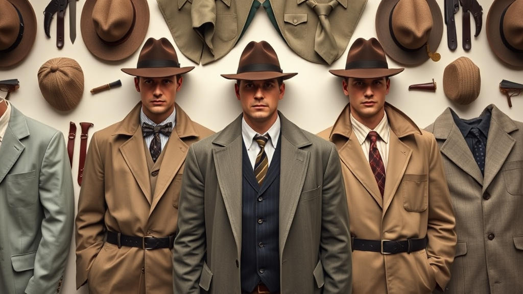 Vintage detective attire meticulously organized in a symmetrically knolled arrangement, with a muted Wes Anderson color scheme, captured under soft, studio lighting, exhibiting a gentle, low contrast effect in ultra-high-definition clarity.