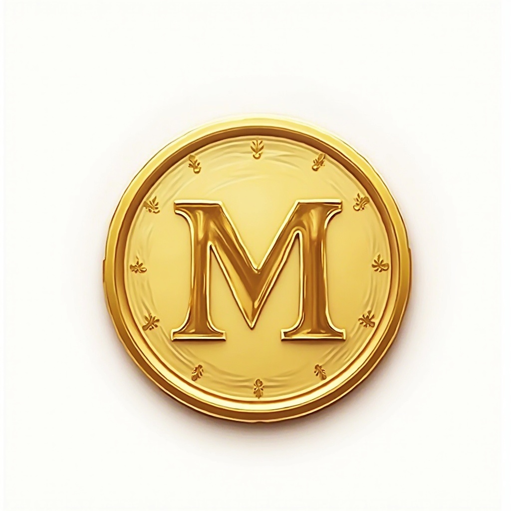 Vintage emblem of the letter M on a coin, featuring a golden yellow color scheme with gentle gradients, set against a white background, incorporating subtle artistic embellishments while maintaining the classic essence.