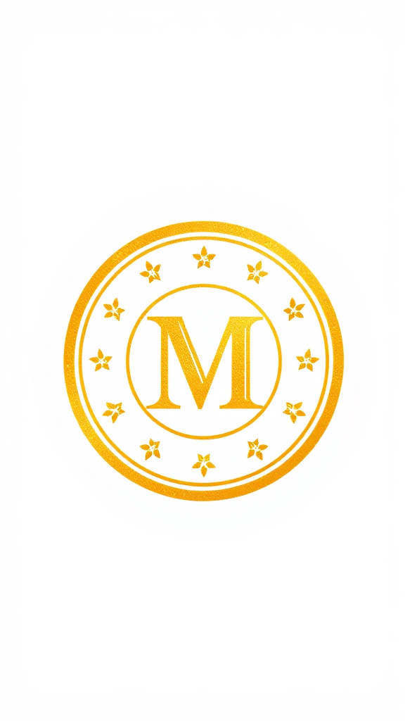 Vintage emblem featuring the iconic letter M centered on a classic coin design, utilizing a golden yellow color palette with nuanced gradients, set against a pristine white background, incorporating subtle embellishments for a timeless yet distinct look.