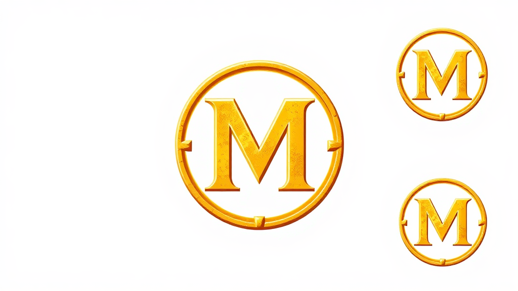 Vintage emblematic design of the letter M on a coin, utilizing a golden-yellow color palette with delicate shading, set against a white background, integrating slight artistic variations while preserving the essential theme.