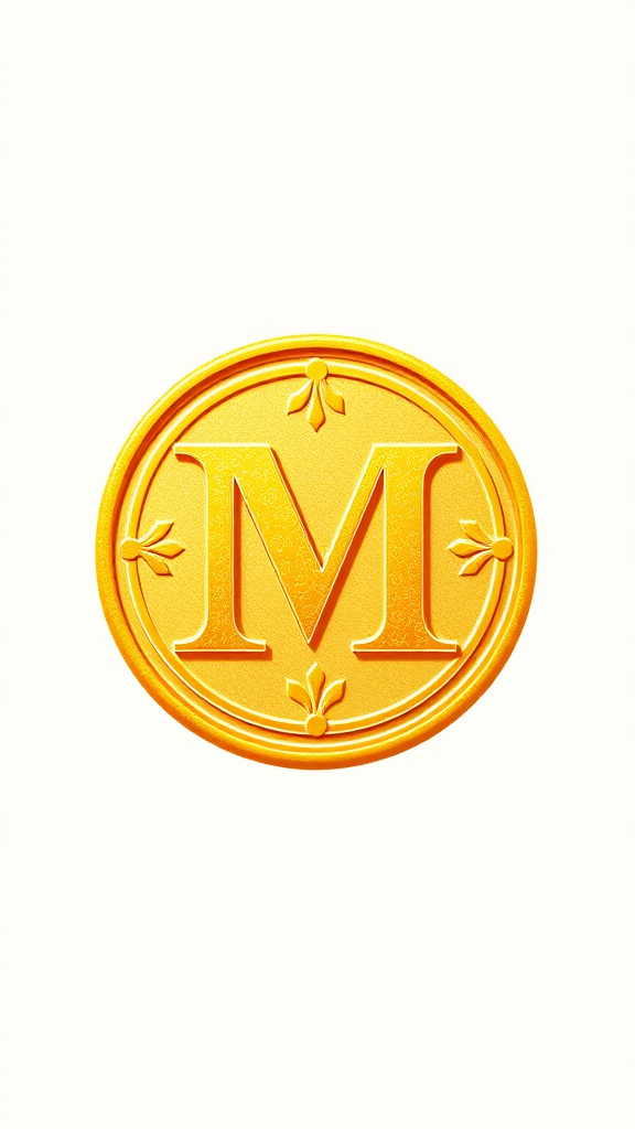 Vintage emblematic logo featuring the letter M, embossed onto a coin design, utilizing a warm yellow color palette with soft gradients, set against a pure white background, integrating intricate detailing and classic design elements for an elegant touch.