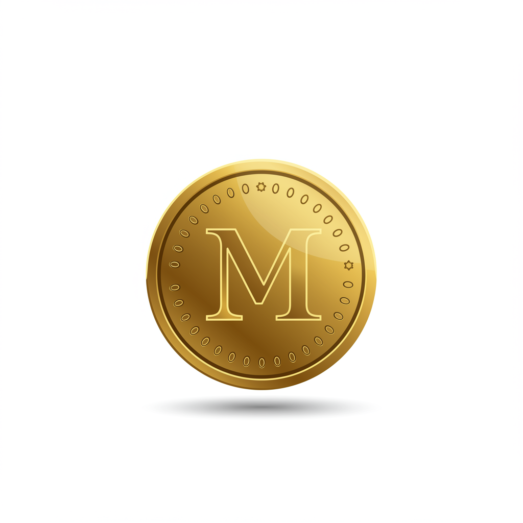 Vintage emblematic logo featuring the letter M on a coin, bathed in a golden color scheme with delicate gradient transitions, set against a white backdrop with slight creative enhancements to maintain the essence.