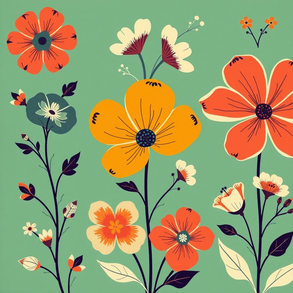 Vintage floral motifs :: mid-century modern style :: vibrant palette :: minimalist elegance :: portrait orientation :: enhanced detail